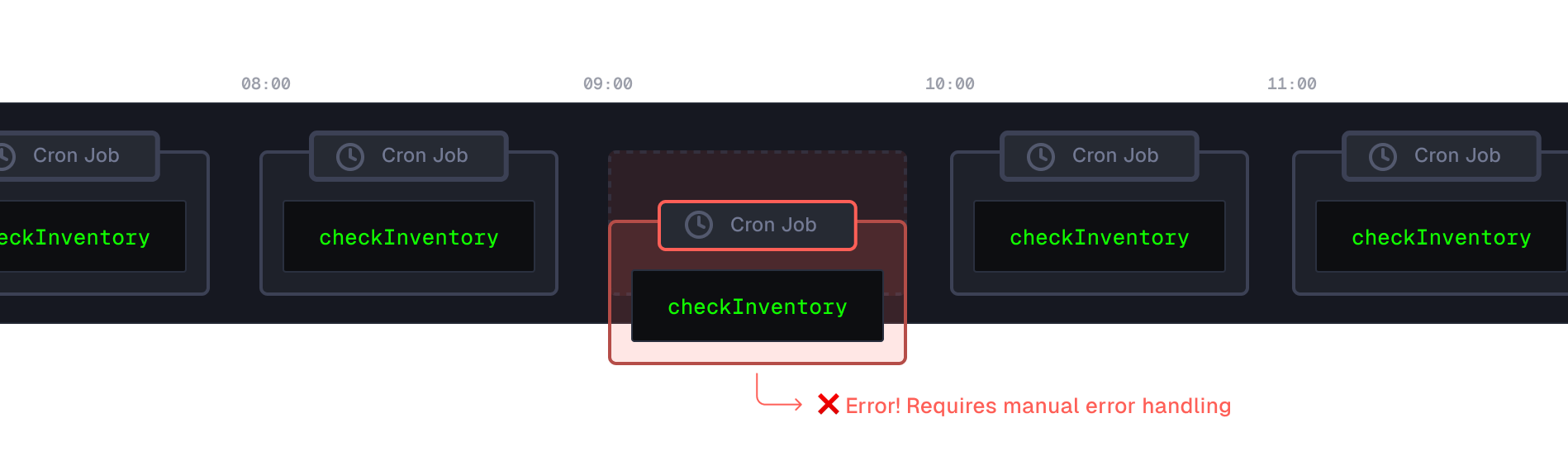 While this method works, it's important to handle potential errors properly. In this case, the checkInventory Cron job failed at 9:00, which could lead to outdated stock levels if not handled properly. This, in turn, can cause overselling, missed restocking, and general fulfillment delays.