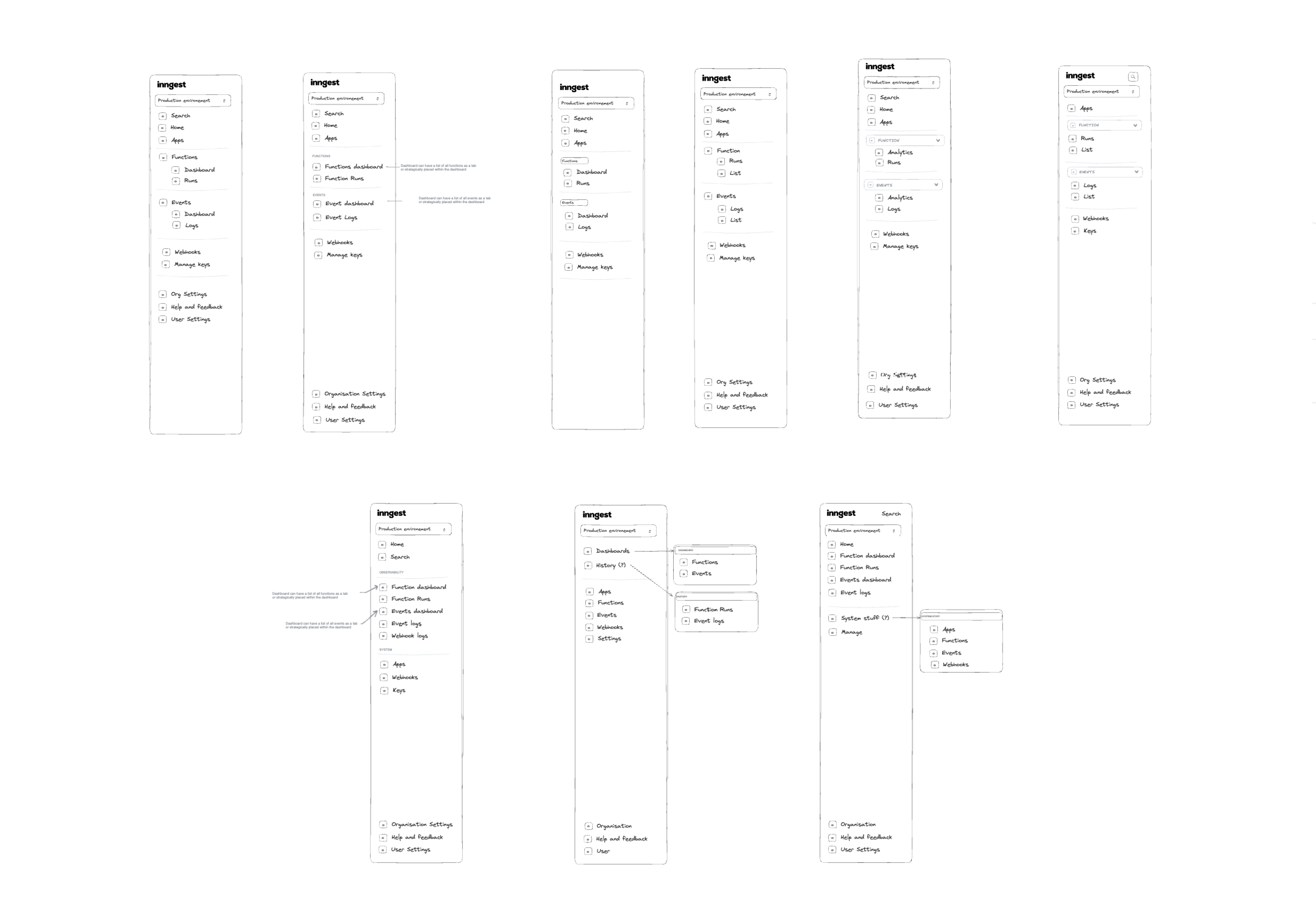 Illustration featuring different mockup iterations of Inngest Cloud's side nav. From top left to bottom right, the navigation gets clearer with grouping around group of actions (for example: "Obserability", "System"). We explored various iterations of organizing information, as seen in the graphic above.